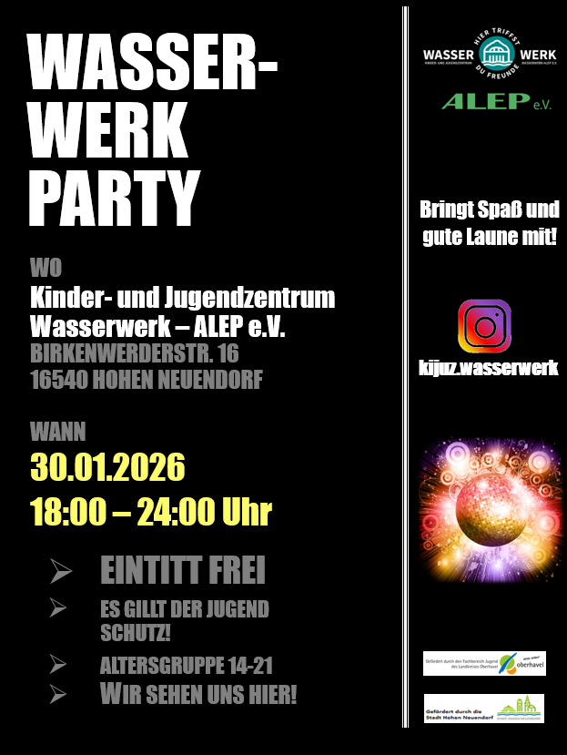 am 30.01.2026 ist es wieder soweit – Party im Wasserwerk für die Altersgruppe 14 bis 21 Jahre.